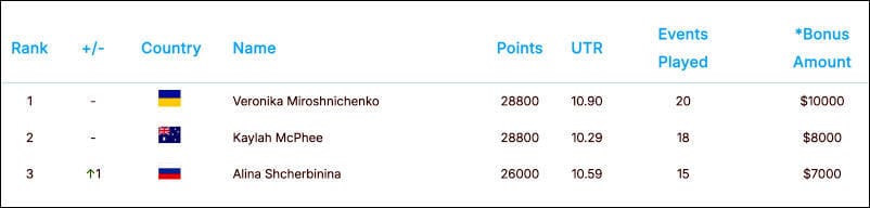 The race rewarded consistency, using each player’s top eight tournament results, with ties broken by UTR rating. On the women’s side, both Veronika Miroshnichenko and Kaylah McPhee (Australia) captured eight tournament victories. Veronika ultimately claimed the top spot thanks to a 0.79 higher UTR rating, underscoring the tour’s emphasis on competitive performance across the season.